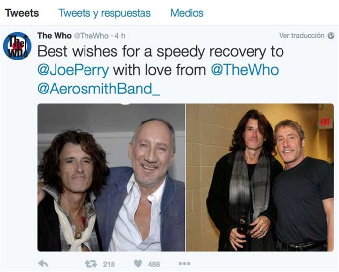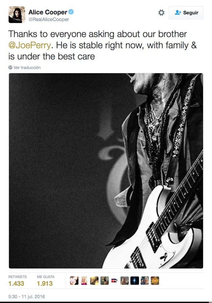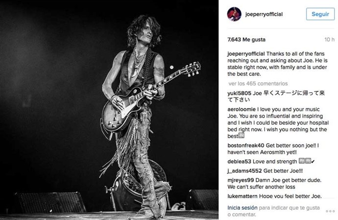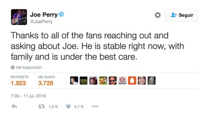El miembro de Aerosmith fue trasladado en ambulancia desde el Anfiteatro de Coney Island Boardwalk, donde fue atendido por los médicos que lograron estabilizarle. Ahora se encuentra rodeado de su familia y del resto de sus compañeros de gira recuperándose del grave incidente. La cuenta de Twitter del compositor tranquilizó a sus millones de fans: “Gracias a todos los fans que se han preocupado y han preguntado por Joe. Está estable en este momento, con la familia y bajo los mejores cuidados”.