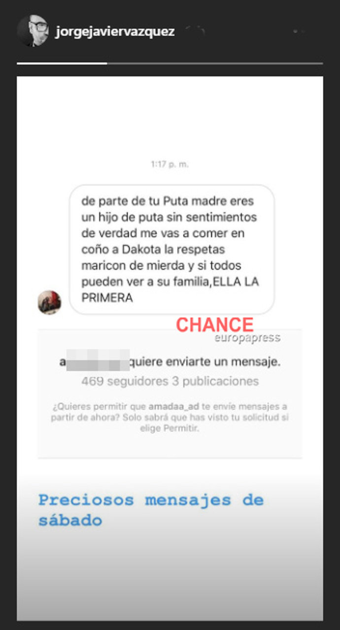 Jorge Javier Vázquez ha querido mostrar a todos sus seguidores de Instagram los insultos que recibe en redes sociales. El presentador ha decidido compartir en sus stories una captura de pantalla donde se lee los graves improperios que le dedica una seguidora.