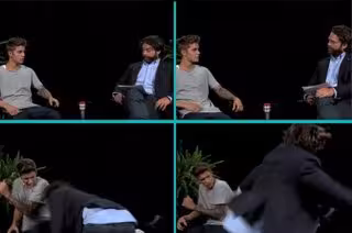 La "bizarra" entrevista ha sido hecha para el portal de comedia, Fun or Die, dentro del contenedor "Between Two Ferns". La falsa entrevista comenzaba con un atónito Justin Bieber que no sabía lo que se iba a enfrentar. Zach Galifianakis comenzaba a lanzar sus "hirientes" opiniones de esta manera: "Gracias, Justin, por estar aquí. Es muy emocionante hablar contigo, especialmente en estos momentos de tu crisis pública".