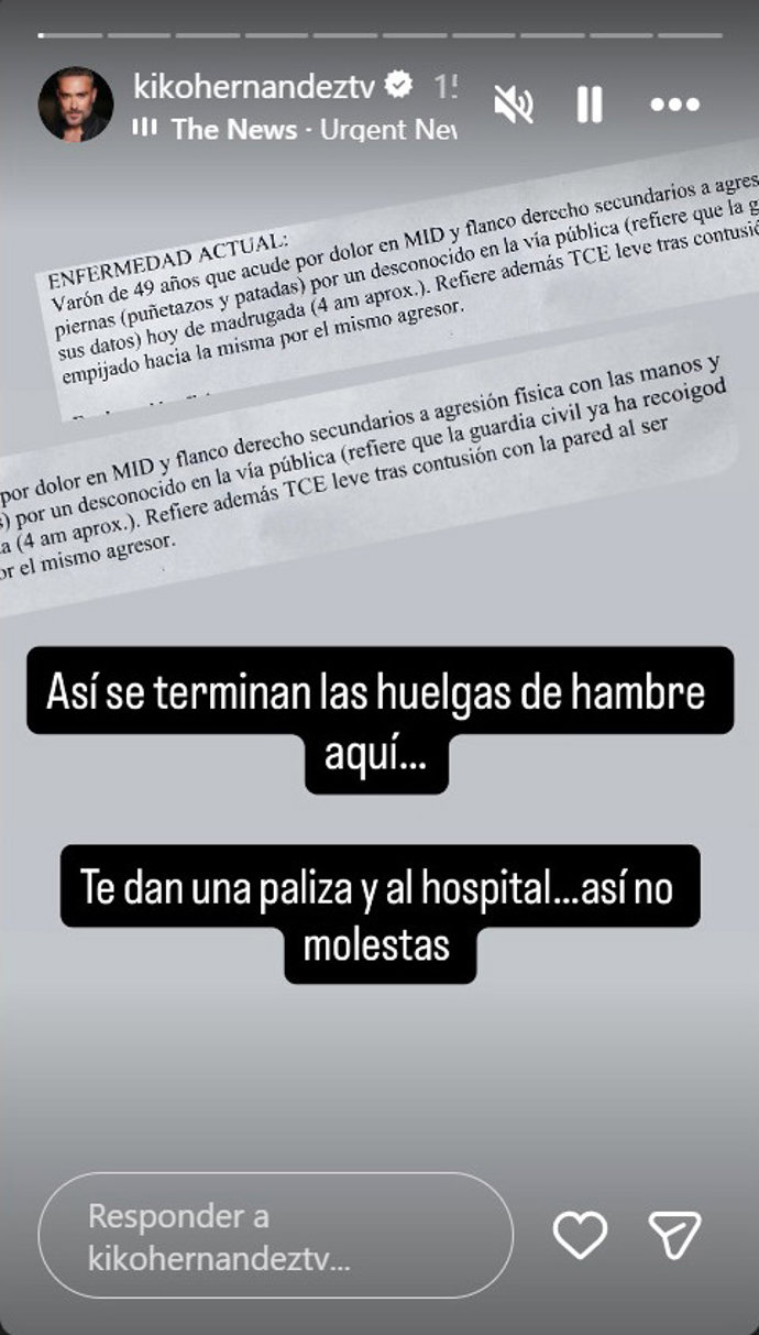 "Así se terminan las huelgas de hambre aquí. Te dan una paliza y al hospital. Así no molestas", ha compartido en redes sociales, mostrando el parte médico que refleja que el televisivo tendría dolores después de recibir "puñetazos y patadas por parte de un desconocido en la vía pública" en las manos y en las piernas, además de presentar un "traumatismo craneoencefálico leve" tras ser empujado contra la pared.