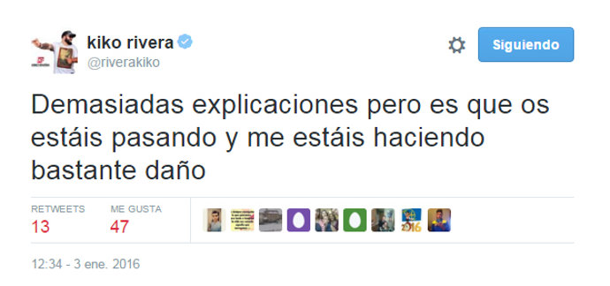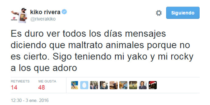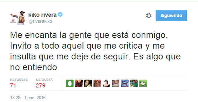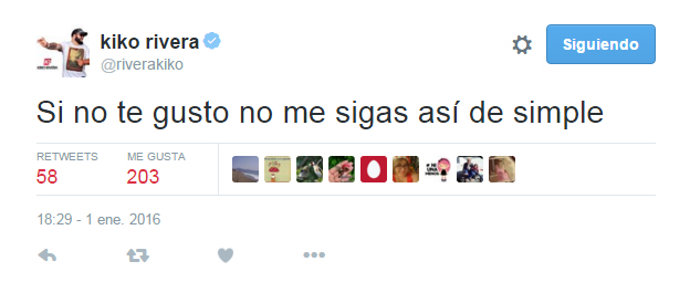 Debido a esto, Kiko Rivera ha tenido que usar la red social de microblogging para defenderse ante las acusaciones vertidas. "Me encanta la gente que está conmigo. Invito a todo aquel que me critica y me insulta que me deje de seguir. Es algo que no entiendo", escribía en un primer momento Kiko con otro tuit relacionado: "Si no te gusto no me sigas así de simple".