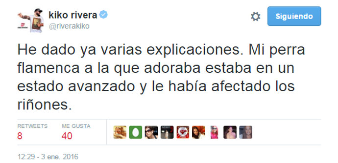 Esta vez, el foco de los comentarios negativos ha sido la muerte de su perrita Flamenca, a la que decía adiós el pasado día 28 de diciembre de 2015 tal y como él mismo publicaba en su cuenta de Instagram. Dichas críticas estarían motivadas por el mal cuidado de la perrita, la cual llegaba a la familia de Kiko el 9 de enero de 2014.