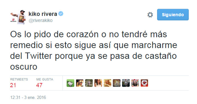 Para terminar las palabras contra sus críticos y para temor de sus fans, el hermano de Francisco y Cayetano Rivera amenazaba con dejar Twitter: "Os lo pido de corazón o no tendré más remedio si esto sigue así que marcharme del Twitter porque ya se pasa de castaño oscuro".