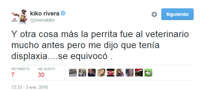 "Es duro ver todos los días mensajes diciendo que maltrato animales porque no es cierto. Sigo teniendo mi Yako y mi Rocky a los que adoro", aseguraba Kiko de nuevo para rematar su alegato con: "Otra cosa más, la perrita fue al veterinario mucho antes pero me dijo que tenía displaxia... Se equivocó".