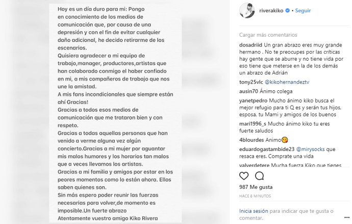 "Hoy es un día muy duro para mi: pongo en conocimiento de los medios de comunicación que, por causa de una depresión y con el fin de evitar cualquier daño adicional, he decidido retirarme de los escenarios", unas impactantes palabras que Kiko ha hecho públicas en su cuenta de Instagram, donde también ha llamado la atención que el hijo de Isabel Pantoja ha borrado absolutamente todas sus publicaciones, dejando únicamente su confesión y eliminando cualquier rastro de su trabajo como de su vida privada.