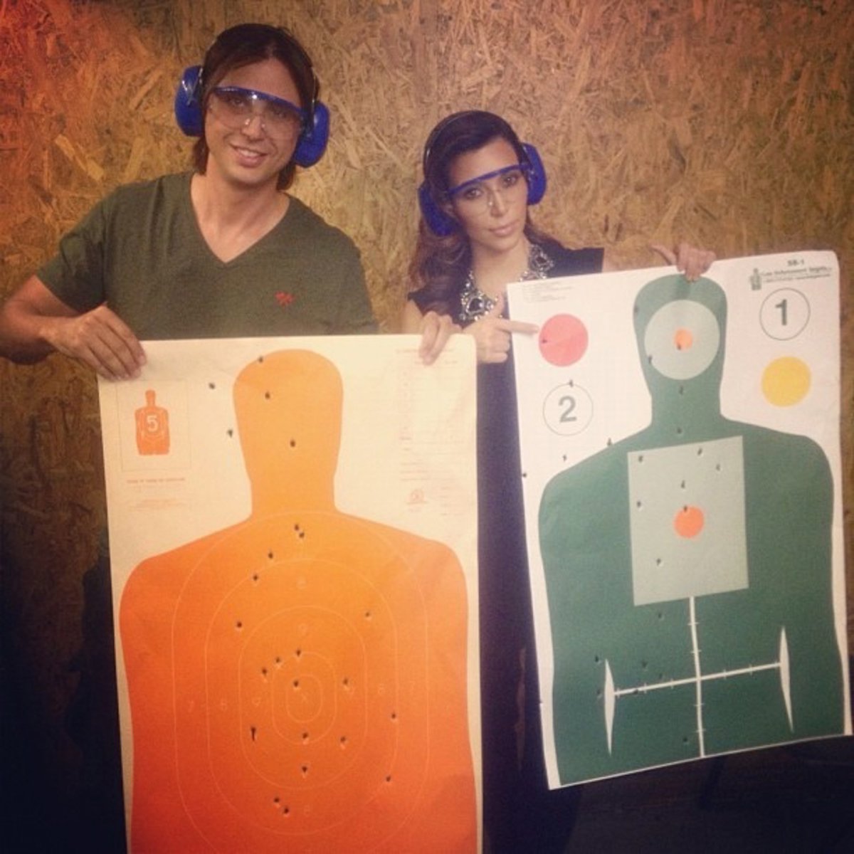 Pero recordemos que estamos hablando de Kim Kardashian, una mujer que parece que no es capaz de vivir sin sus estilismos arriesgados y provocativos, y como no, aunque se encontrase en una sala de tiro, ella ha acudido a practicar con las armas enfundada en un ajustadísimo mono negro complementado con un maxi collar y un clutch del mismo tono. Además, de subirse en unos tacones de infarto muy poco apropiados para la ocasión.