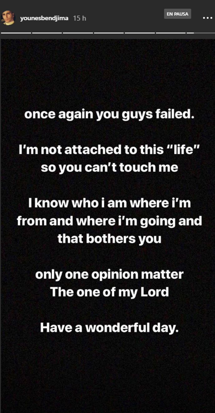 Decepcionado con los medios, después publicó otro stories con el siguiente comunicado: "Una vez más habéis fallado. No estoy unido a esta 'vida' así que no me podéis hacer nada. Sé quién soy, de dónde soy y dónde voy y eso os molesta. Sólo importa la opinión de mi Señor. Tened un buen día".