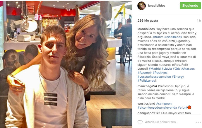 "Hoy hace una semana que despedí a mi hijo en el aeropuerto feliz y orgullosa. @franmurciadibildos Han sido muchos años de esfuerzo jugando y entrenando a baloncesto y ahora han tenido su recompensa porque se va con una beca para jugar y estudiar en Filadelfia. Eso sí, vaya jartá a llorar me di de vuelta a casa...aunque crezcan, siguen siendo nuestros niños..."