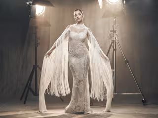 Las formas orgánicas que emulan un panal de abejas y los detalles de pedrería en forma de hojas y ondas marinas completan el diseño, realizado con cristales que evocan la belleza del Mediterráneo. La silueta asimétrica y el corte sirena del vestido aportan un toque de sofisticación, reflejando la esencia joven y elegante de Laura Escanes.