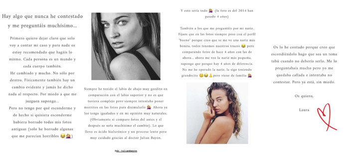 La modelo se muestra muy feliz y contenta con el resultado y considera que ahora tiene unos labios muy bonitos y, sobre todo, naturales: "No es que tuviera complejo pero siempre intentaba poner morritos en las fotos para disimularlo. Ahora ya los tengo igualados y en mi opinión muy naturales".