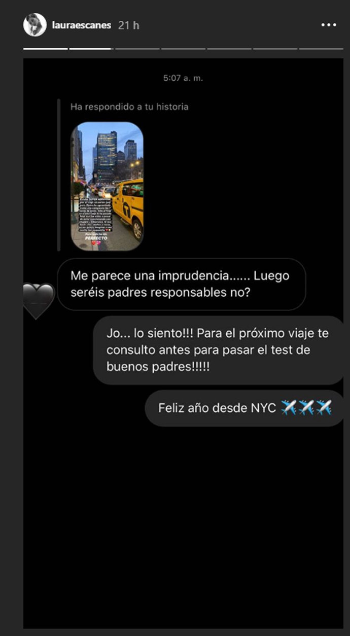 Un comentario al que la joven influencer no dudó en responder: "Jo... lo siento!! Para el próximo viaje te consulto antes para pasar el test de buenos padres!! Feliz año desde NYC". Un mensaje cargado de ironía que ha querido compartir con todos sus seguidores para que nada ni nadie le amargue esta estancia tan idílica en la ciudad que nunca duerme.