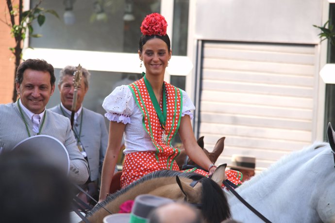Sorprendente la aparición a caballo de Victoria Federica con un look ideal junto a los miembros de la Directiva de la Hermandad de Triana, acaparando todas las miradas en su debut en el camino a Almonte, que ya hizo hace décadas la infanta Elena con el mismo traje rociero anaranjado con pequeños lunares blancos que hoy ha lucido su hija.