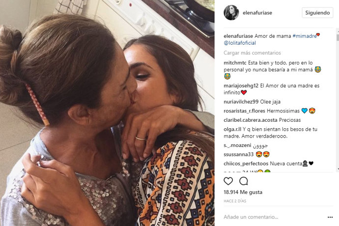 Elena Furiase ha compartido una imagen en la que aparecen ella y su madre dándose un beso en los labios en la cocina de su casa en una actitud completamente cotidiana bajo el titulo "Amor de mama". La foto que ha sido considerada por muchos como un "precioso gesto de amor", se ha convertido en el objetivo de los más dañinos de la red, que han atacado a las artistas por besarse en la boca.