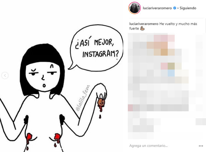 Sin embargo, esta vez la publicación iba acompañada de otra imagen con la que Lucía manda un contundente mensaje a la plataforma. Se trata de una ilustración en la que aparece una mujer que se ha arrancado los pezones para contentar a las exigencias de Instagram ante la pregunta: "¿Mejor así?".