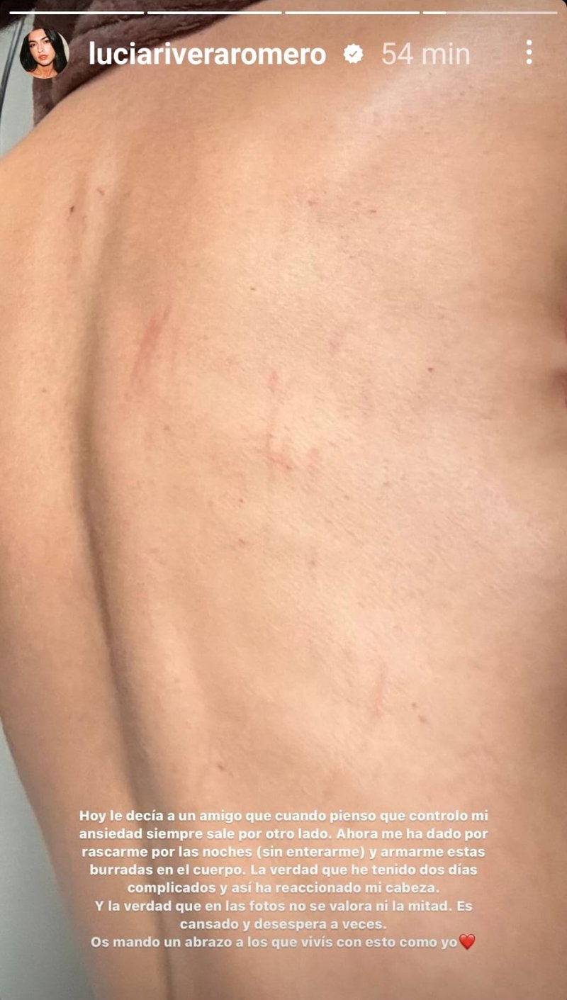 "Hoy le decía a un amigo que cuando pienso que controlo mi ansiedad siempre sale por otro lado. Ahora me he dado por rascarme por las noches (sin enterarme) y armarme estas burradas en el cuerpo. La verdad que he tenido dos días complicados y así ha reaccionado mi cabeza. Y la verdad que en las fotos no se valora ni la mitad. Es cansado y desespera a veces. Os mando un abrazo a los que vivís con esto como yo" ha confesado en su storie.