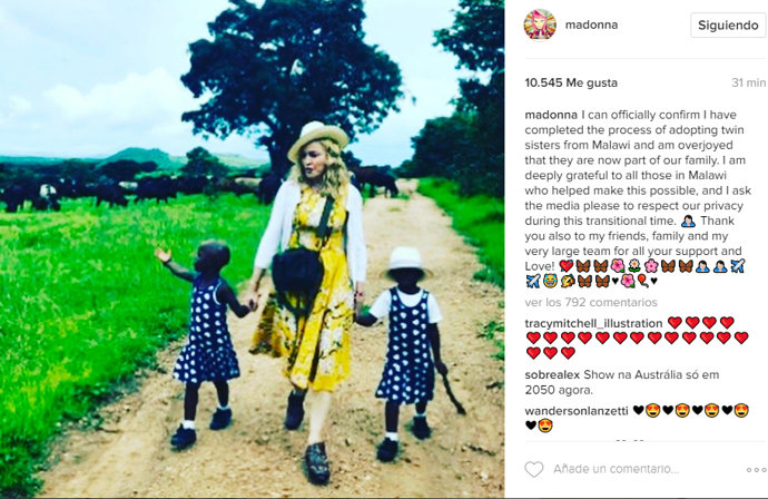 La reina del pop también ha aprovechado para dar las gracias a todos los que le han ayudado durante este proceso: "Estoy profundamente agradecida a todos los que en Malawi han ayudado a que esto sea posible. Gracias también a mis amigos, familia y mi gran equipo por todo su apoyo y amor" y ha querido enviar un mensaje a los medios de comunicación pidiendo respeto y privacidad: "Les pido a los medios de comunicación que respeten nuestra privacidad durante este período de transición".