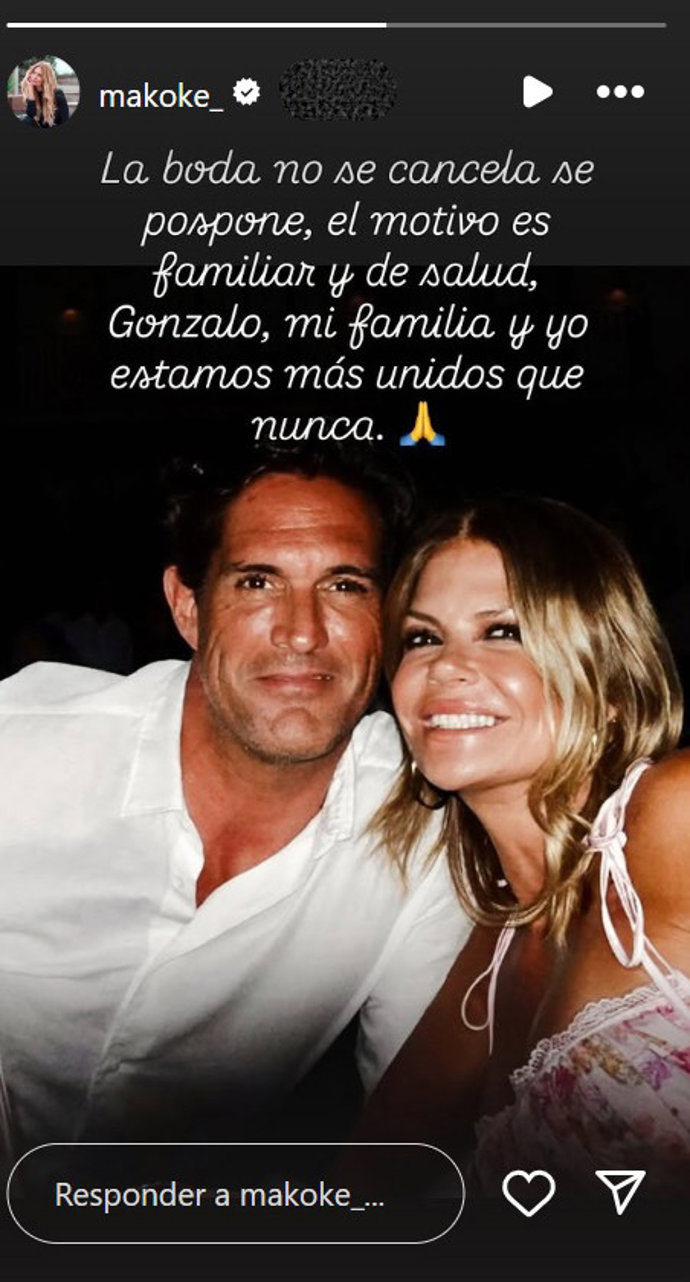 Un mensaje que eliminaba de sus historias de Instagram para publicar otro similar aunque más escueto en el que, utilizando la misma instantánea que refleja su unión incondicional con su todavía prometido, y sin entrar en detalles, se ha reafirmado en que su enlace no se ha anulado definitivamente: "La boda no se cancela, se pospone. El motivo es familiar y de salud. Gonzalo, mi familia y yo estamos más unidos que nunca" ha asegurado, negando así cualquier posible crisis con su futuro marido.