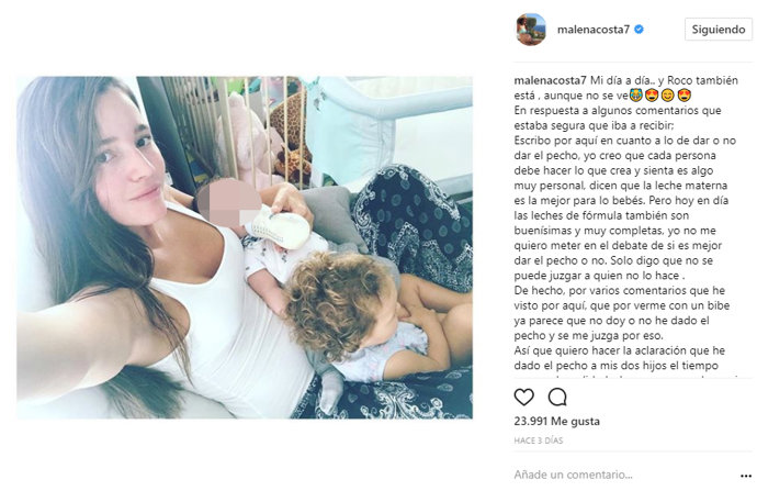 Indignada Malena ha publicado un texto contestando a las críticas y defendiendo que dar el pecho o el biberón no te hace mejor madre y que antes de juzgar habría que pensar en las circunstancias de cada uno: "Cada persona debe hacer lo que crea y sienta es algo muy personal, dicen que la leche materna es la mejor para lo bebés, pero hoy en día las leches de fórmula también son buenísimas y muy completas, yo no me quiero meter en el debate de si es mejor dar el pecho o no. Solo digo que no se puede juzgar a quien no lo hace".