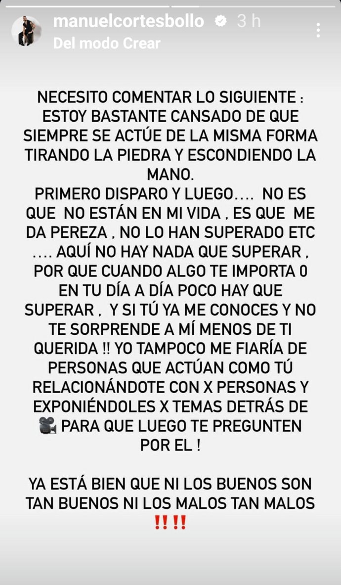 Ahora, Manuel Cortés Bollo ha utilizado sus redes sociales para contestar una vez más a Isa y ha confesado que está "bastante cansado de que siempre se actúe de la misma forma tirando la piedra y escondiendo la mano".