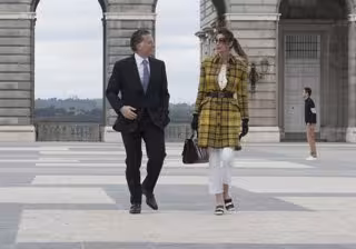 Caras sonrientes, y muy bien vestidos y arreglados, ella luciendo un look muy otoñal con un abrigo de paño en tonos amarillos con cuadros, debido a la vuelta del mal tiempo que estamos sufriendo en Madrid estos días, y él, con riguroso y elegante traje oscuro, corbata morada y camisa blanca, un estilo habitual de alguien de su posición y obligaciones, ya que, Sacal es uno de los empresarios más importantes de México en el sector inmobiliario.