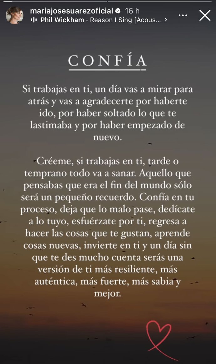 En un emotivo mensaje compartido en sus redes sociales, María José ha expresado su confianza en que el tiempo y el trabajo personal curarán las heridas. En sus palabras, anima a sus seguidores a confiar en el proceso de sanación: "Si trabajas en ti, un día vas a mirar para atrás y vas a agradecerte por haberte ido, por haber soltado lo que te lastimaba y por haber empezado de nuevo. Créeme, si trabajas en ti, tarde o temprano todo va a sanar. Aquello que pensabas que era el fin del mundo sólo será un pequeño recuerdo".