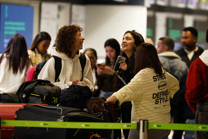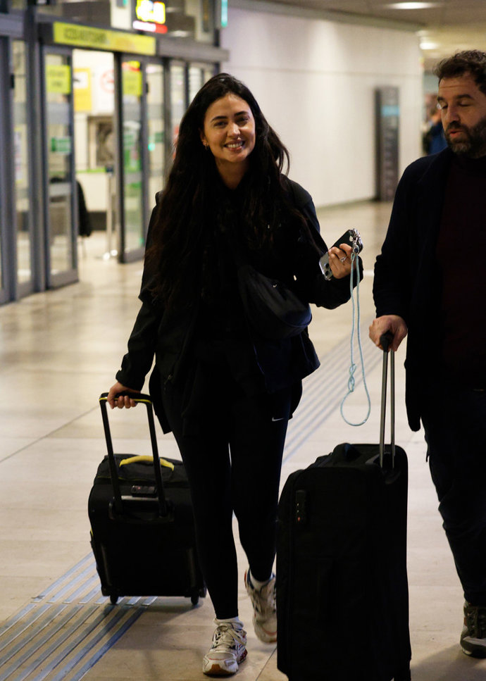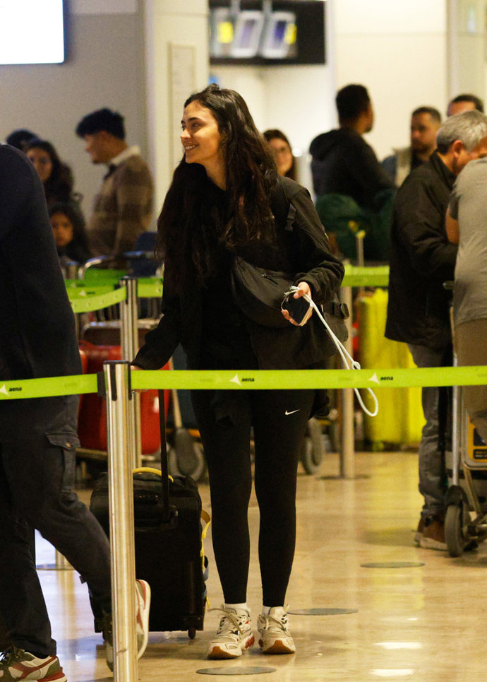 Especialmente cómoda y tranquila junto a sus compañeros, María intercambió charla y risas con ellas mientras realizaban todas las gestiones relacionadas con el equipaje y los pasaportes. Sin separarse de su teléfono móvil en ningún momento, eligió para la ocasión un look muy cómodo para todo el viaje con chándal de color negro y zapatillas de deporte.
