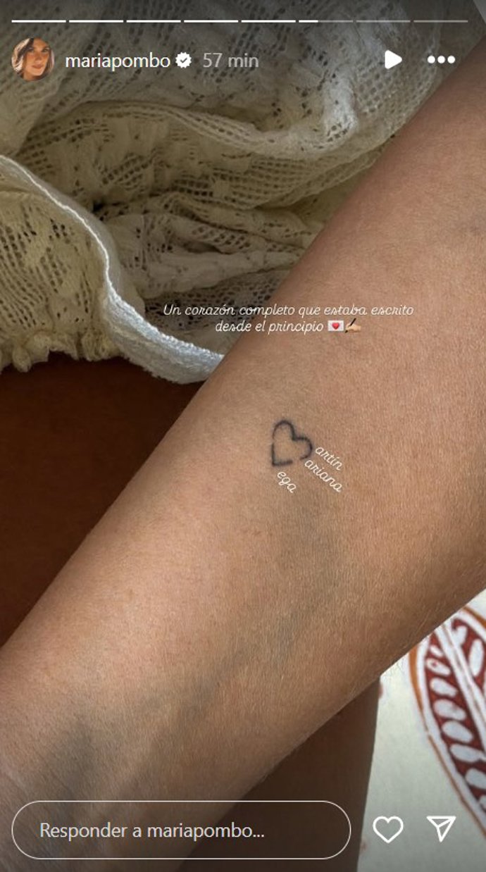 Pombo ha colgado una instantánea en la que podemos ver un tatuaje que tiene en uno de sus brazos con forma de corazón y que ahora cobra todo el sentido. Formado por el signo < y el número 3, <3, el < sería la V inicial de Vega y el 3, dado la vuelta, sería la M de Martín y Mariana.