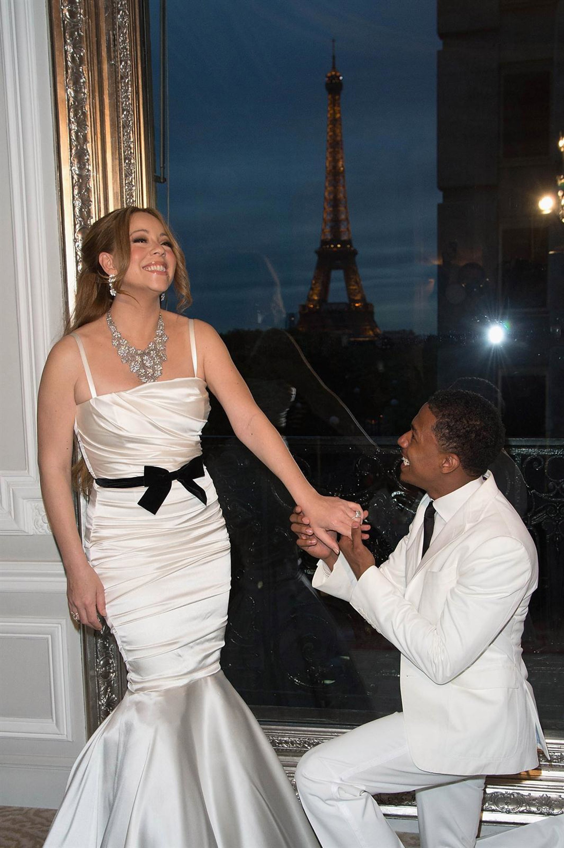 Nick y Mariah reunieron a la prensa en una fiesta llena de glamour, en un hotel cercano a la Torre Eiffel, en donde posaron con las clásicas vistas de la torre iluminada, como en un cuento de hadas.