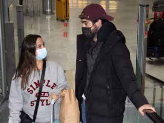 Optando por un look muy cómodo para el viaje con pantalón de punto y sudadera en tonos grises y burdeos, Marta no pudo esconder una gran sonrisa en su rostro de felicidad a pesar de la mascarilla.
