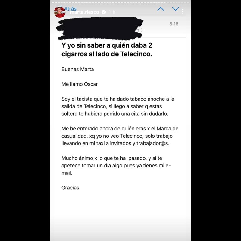 Un taxista le escribía un correo a Marta diciéndole que "si llego a saber que estas soltera te hubiera pedido una cita" después de haberle "dado tabaco anoche a la salida de Telecinco". Unas palabras que la reportera tampoco entendía en un primer momento, pero que rápidamente identificaba que no iban para ella, sino para Marta López.
