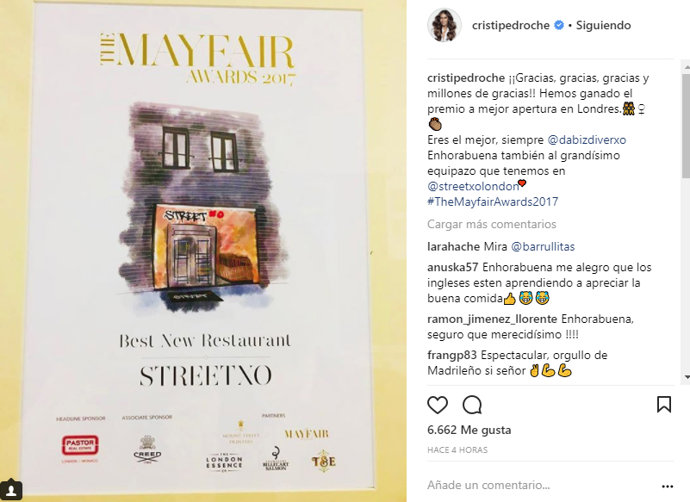 Cristina Pedroche publicaba una foto en su Instagram para contar a todos sus seguidores la buena noticia que ha recibido. El restaurante StreetXo ganaba el premio a mejor apertura en Londres.