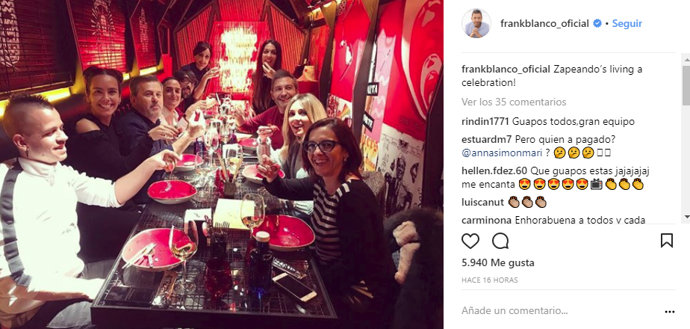 Además, ayer por la noche, Frank Blanco publicaba una foto en su Instagram de todos los colaboradores del programa Zapeando, entre los que está Cristina Pedroche, cenando en el restaurante StreetXo de Madrid con el mensaje: "Zapeando's living a celebration!", y es que hace pocos días cumplían 1000 programas, por lo tanto Cristina Pedroche y su marido estaban de doble celebración, esperemos que sigan ganando premios y obteniendo éxitos en sus vidas profesionales, ya que en lo personal parece que les va también de miedo.
