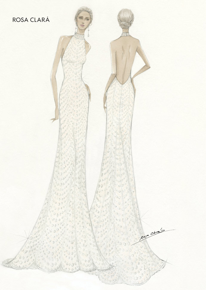 La mallorquina ha confiado en Rosa Clará para su gran día y ha lucido dos vestidos. Con el que ha subido al altar es un diseño de alta costura. Un diseño artesano y elegante, bordado a mano, de manga larga y escote a la caja con cuerpo realizado en encaje francés inspirado en el movimiento artístico Art Déco. Tal y como aparece en el dibujo, incluye pedrería bordada a mano.