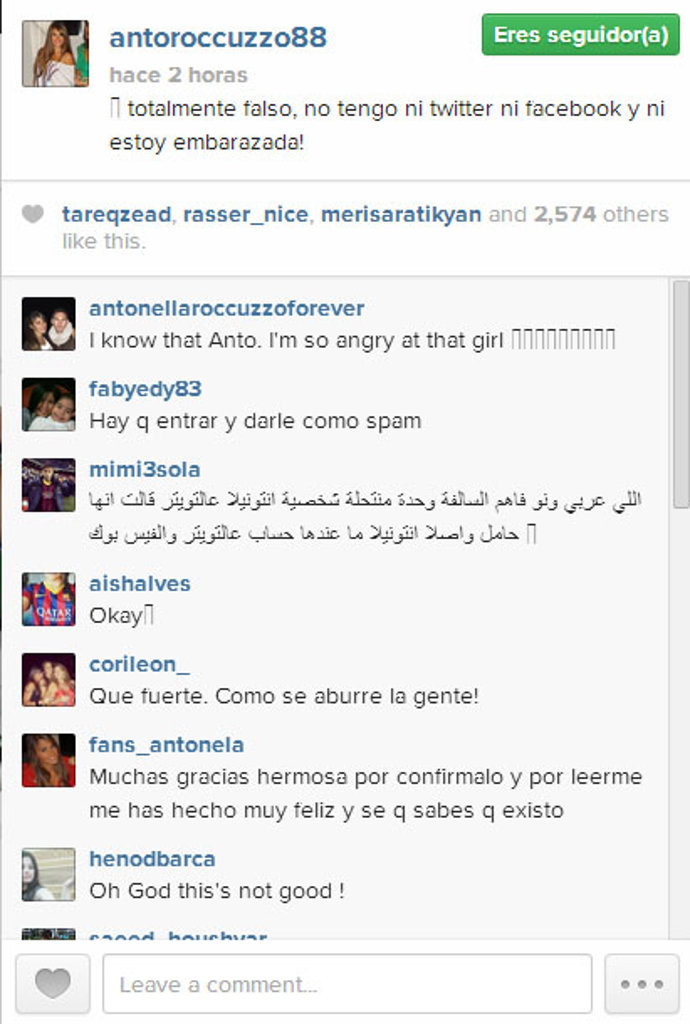 Ha sido la propia Antonella, novia de Leo Messi, la que ha desmentido en su perfil de Instagram que esté embarazada tras la publicación de un tuit en el que anunciaban que estperaban su segundo hijo. La joven ha querido dejar claro que no tiene ni twitter, ni Facebook.
