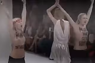Hollie-May Saker, una modelo de 18 años, estaba en plena pasarela luciendo uno de los vestidos de la firma cuando dos espontáneas en topless se lanzaron hacia su posición y la cogieron del brazo.