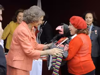 La humorista Mari Carmen acudía con su inseparable Doña Rogelia, toda de rojo con boina en la cabeza, y se acercaban a saludar a Doña Sofía que, muy simpática, se mostraba de lo más cariñosa. Tanto es así que no dudó en charlar con ella e incluso se atrevía a tocarle la nariz demostrando así la confianza que sentía en ese momento.