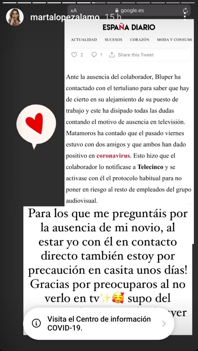 "Para los que me preguntáis por la ausencia de mi novio, al estar yo con él en contacto directo, también estoy por precaución en casita unos días. Gracias por preocuparos al no verlo en televisión. Supo del positivo el martes y desde ayer" estas han sido las palabras de Marta López en su perfil de Instagram para confesar por qué Kiko Matamoros ha desaparecido del programa en el que colabora durante estos días.