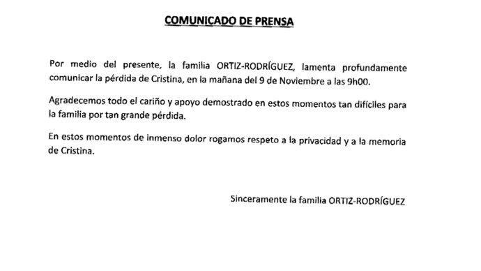La familia de la fallecida artista ha enviado un comunicado a los medios de comunicación anunciando el fallecimiento que ha tenido lugar a las 9:00h del 9 de noviembre y agradeciendo el cariño y apoyo demostrado en estos difíciles momentos, aprovechando también dicho comunicado para pedir respeto a la privacidad y memoria de Cristina.