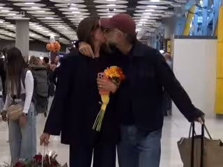 Bill le esperaba con un ramo de flores y cuando la modelo le ha localizado con la mirada no ha dudado en ir hasta él, coger las flores y protagonizar un romántico beso en el aeropuerto después de haber estado separados unos días por motivos profesionales.