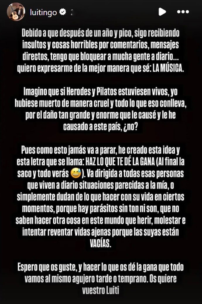"Debido a que después de un año y pico sigo recibiendo insultos y cosas horribles por comentarios, mensajes directos, tengo que bloquear a mucha gente a diario... Quiero expresarme de la mejor manera que sé: LA MÚSICA. Imagino que si Herodes y Pilatos estuviesen vivos, yo hubiese muerto de manera cruel y todo lo que eso conlleva, por el daño tan grande y enorme que le causé y le he causado a este país, ¿no? Pues como eso jamás va a pasar, he creado esta idea y esta letra que se llama: Haz lo que te de la gana(Al final la saco y todo verás)", ha pubilcado en Instagram harto de los ataques de los fans de Jessica, que siguen recordándole que "es una diosa" y que no entienden como pudo estar con él.