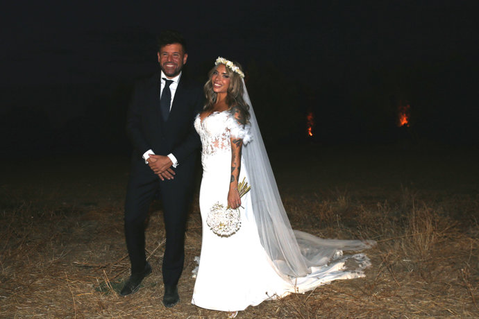 De aire romántico, se trata de un dos piezas con un corpiño de encaje con flores y hojas bordadas en hombros, de escote corazón y tirante caído. La falda, de corte sirena, lleva una discreta cola y en su melena, suelta y ondulada, Laura ha escogido una corona de flores blancas, de donde salía un vaporoso velo.El ramo, ha sido un cariñoso guiño a su marido, un bouquet de biznagas, la flor típica de Málaga.