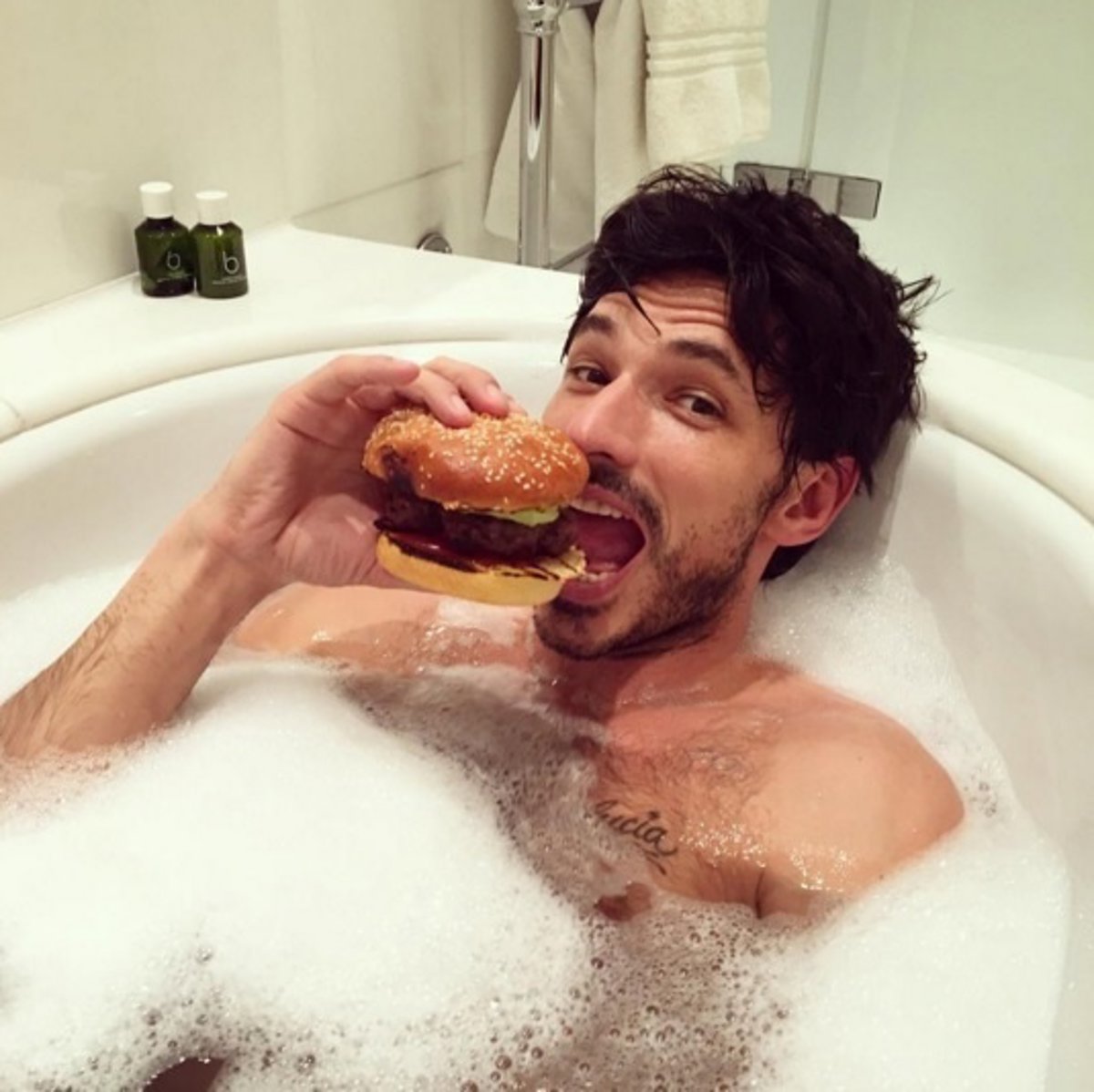 El modelo se decantó por disfrutar de la gala desde la bañera y comiéndose una suculenta hamburguesa. Un envidiable plan de sábado noche del que dejó constancia a través de su cuenta de Instagram en la que compartió esta divertida imagen en la que se puede ver al modelo y actor, recientemente mudado a Londres, darse un homenaje de los que no hacen daño de vez en cuando.