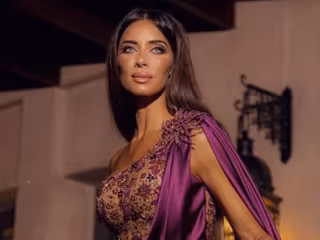Un vestido joya de del diseñador Zuhair Murad con cuerpo estilo corsé de pedrería y abalorios en dorado y escote asimétrico con una especie de túnida de seda morada que, partiendo de uno de sus hombros y con un drapeado y una caída perfecta, llega hasta la cintura para convertirse en una impactante falda con una abertura interminable casi hasta la cadera. ¡Una auténtica diosa griega!