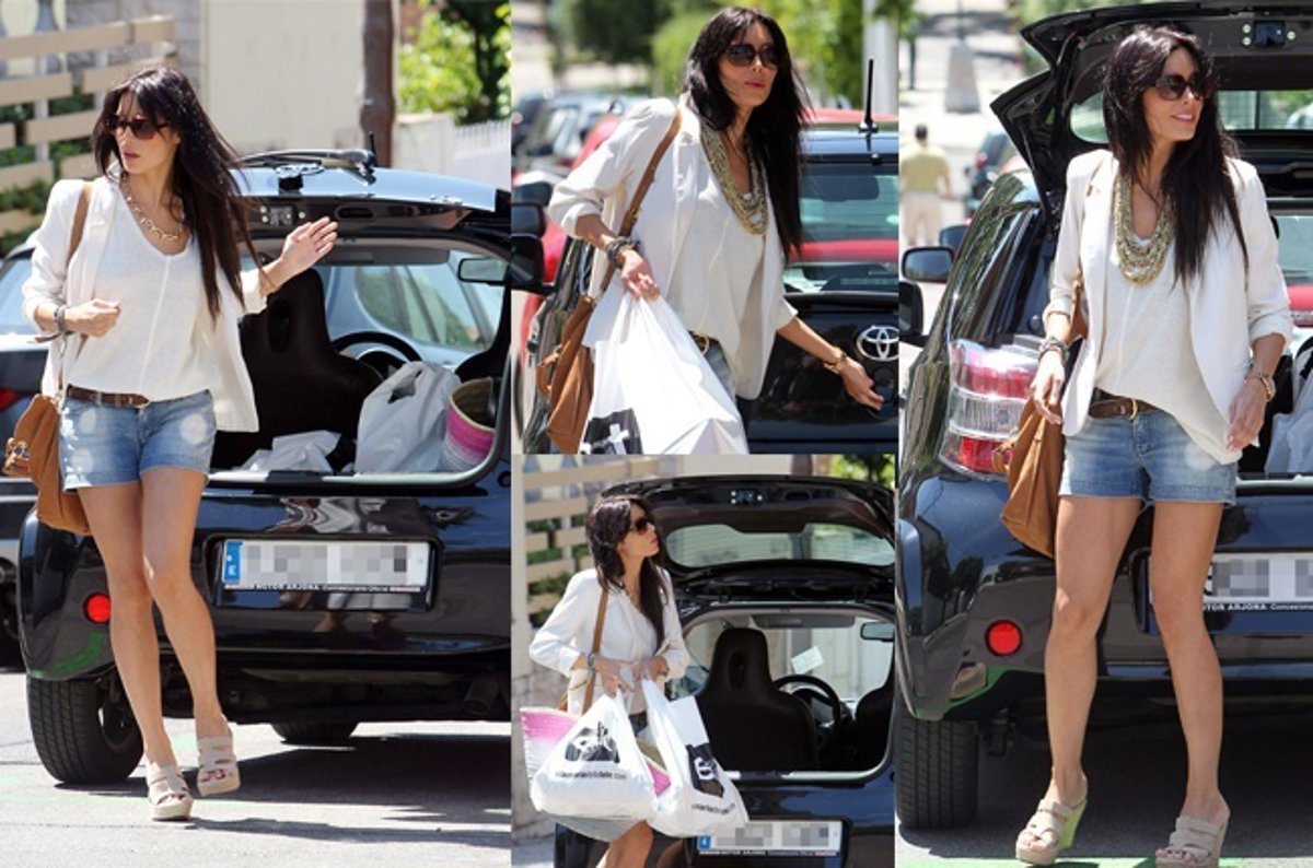 Muy coqueta y ataviada con un short vaquero conjuntado con una camiseta ancha y una blazer de color blanco. Gafas de sol, un impresionante bolso marrón y unas sandalias de cuña en color beige, son los complementos que completan el outfit de la presentadora.