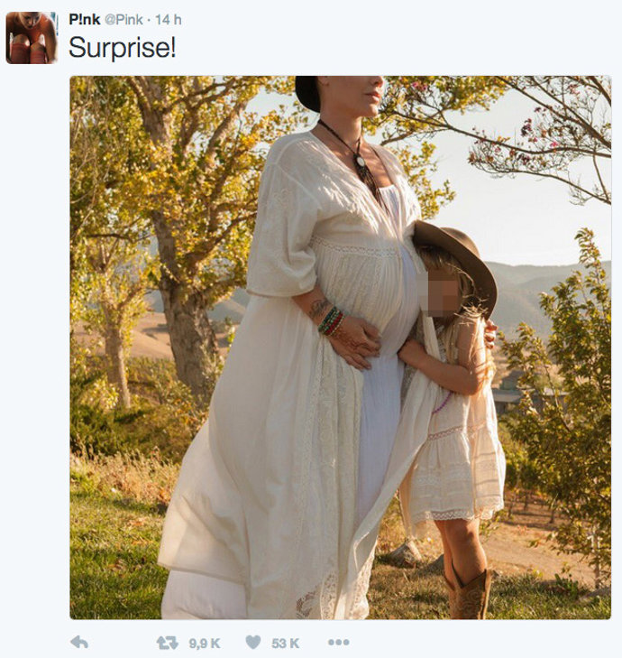 La cantante Pink utilizó las redes sociales ayer sábado para anunciar la noticia de su segundo embarazo. "¡Sorpresa!", escribió la ganadora de un Grammy junto a una foto en la que su hija, Willow Sage, que posa su cabeza en el regazo de la tripita de la estrella musical. El dúo llevaba unos vestidos blancos y sombreros coordinados.