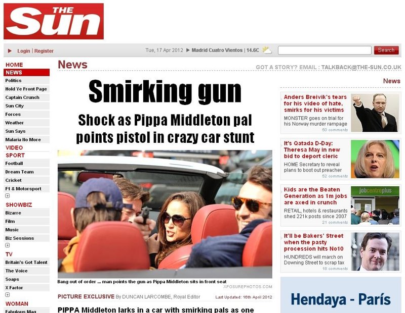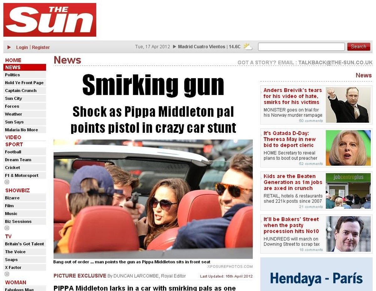 Pippa y sus amigos disfrutaron este fin de semana de la ciudad a bordo de un lujoso Audi descapotable, pero al pararse en un semáforo uno de los acompañantes quiso hacer la gracia y empuñó una pistola con tal mala suerte que un fotógrafo captó todos sus movimientos y lo denunció ante la policía de París.