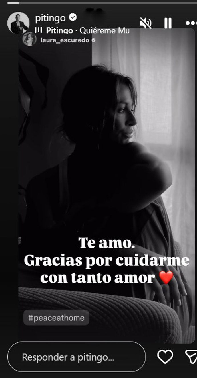 A su lado en todo momento, Laura Escuredo, con la que se dará el 'sí quiero' en octubre y a la que ha querido agradecer su apoyo incondicional en estos duros momentos compartiendo una imagen en blanco y negro de su prometida: "Te amo, gracias por cuidarme con tanto amor" ha escrito, acompañando su mensaje de su canción 'Quiéreme mucho' junto al hastag 'peace at home' ('paz en casa').