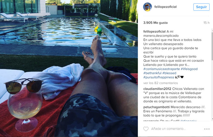 El tenista ha aprovechado sus días de descanso para mandar un mensaje a todos sus seguidores que nos hace pensar que el exmarido de Alba Carrillo ya habría encontrado a alguien por el que late su corazón. La letra del último hit de Shakira y Carlos Vives ha servido para que Feliciano lance su último mensaje: "A mi manera, descomplicado. En una bici que me lleva a todos lados. Un vallenato desesperado, una cartica que yo guardo donde te escribí, que te sueño y que te quiero tanto, que hace ratico que está en mi corazón latiendo por ti, latiendo por ti...".