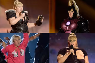 Uno de los vestidos que ha lucido Rebel y que ha causado un gran impacto ha sido en el que aparecía con un doble pezón de mentira. El vestido de color morado oscuro con pedrería incluida es muy elegante y corriente a excepción del toque de humor que Rebel Wilson trajo a la gala. La actriz quiso recordar el momento en el que Justin Timberlake arrancó una parte del vestido de Janet Jackson, dejando a la cantante con un pecho al descubierto durante la actuación de la Super Bowl en el año 2004.