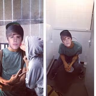 Las dos fotografías muestran al falso Justin Bieber, incluso en una Rihanna le da un beso en la mejilla, pero en la otra está sentado en la taza del retrete. ¿Tendrá algún significado esta imagen?